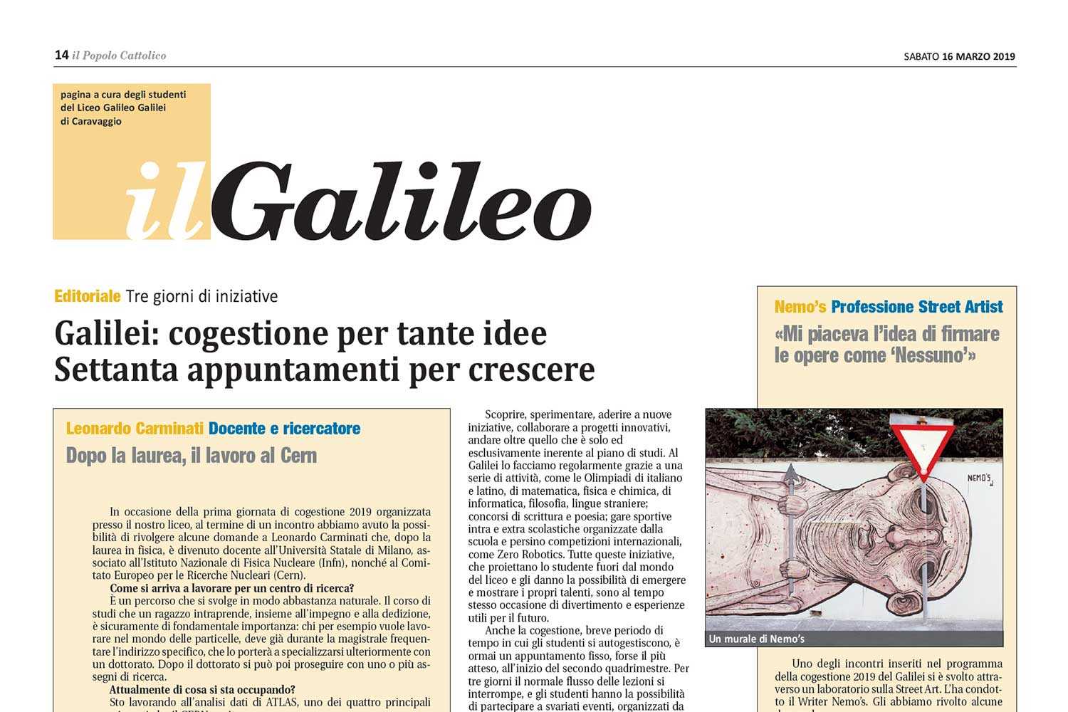 ll Galileo di marzo 2019, allegato al "Popolo Cattolico" del 16 marzo, prende spunto dalla recente cogestione, con un editoriale di Giorgia Jamoletti, e quattro interviste ad altrettanti relatori invitati alla tre-giorni del liceo: il ricercatore Leonardo Carminati (Beatrice Bignami e Mara Maggi), lo Street Artist Nemo’s (Irma Invernizzi), il professor Vittorio Erbetta (Riccardo Morino) e la giovane influencer Ludovica Pagani (Viola Piana).