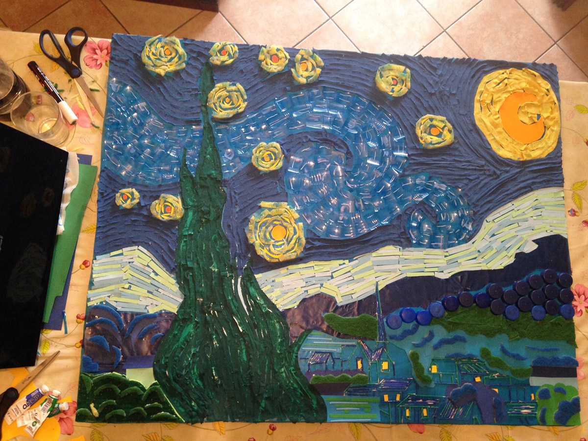 Le fasi della realizzazione della "versione riciclata" di "Notte stellata" di Van Gogh. La rielaborazione di Elisa Palladini, Elena Margiotta e Sabrina Capelletti, della classe 5a A, ha vinto il secondo premio del concorso "io invento: il riciclo tra arte e scienza", organizzato dall'associazione Matexplora e dal museo Explorazione di Treviglio.