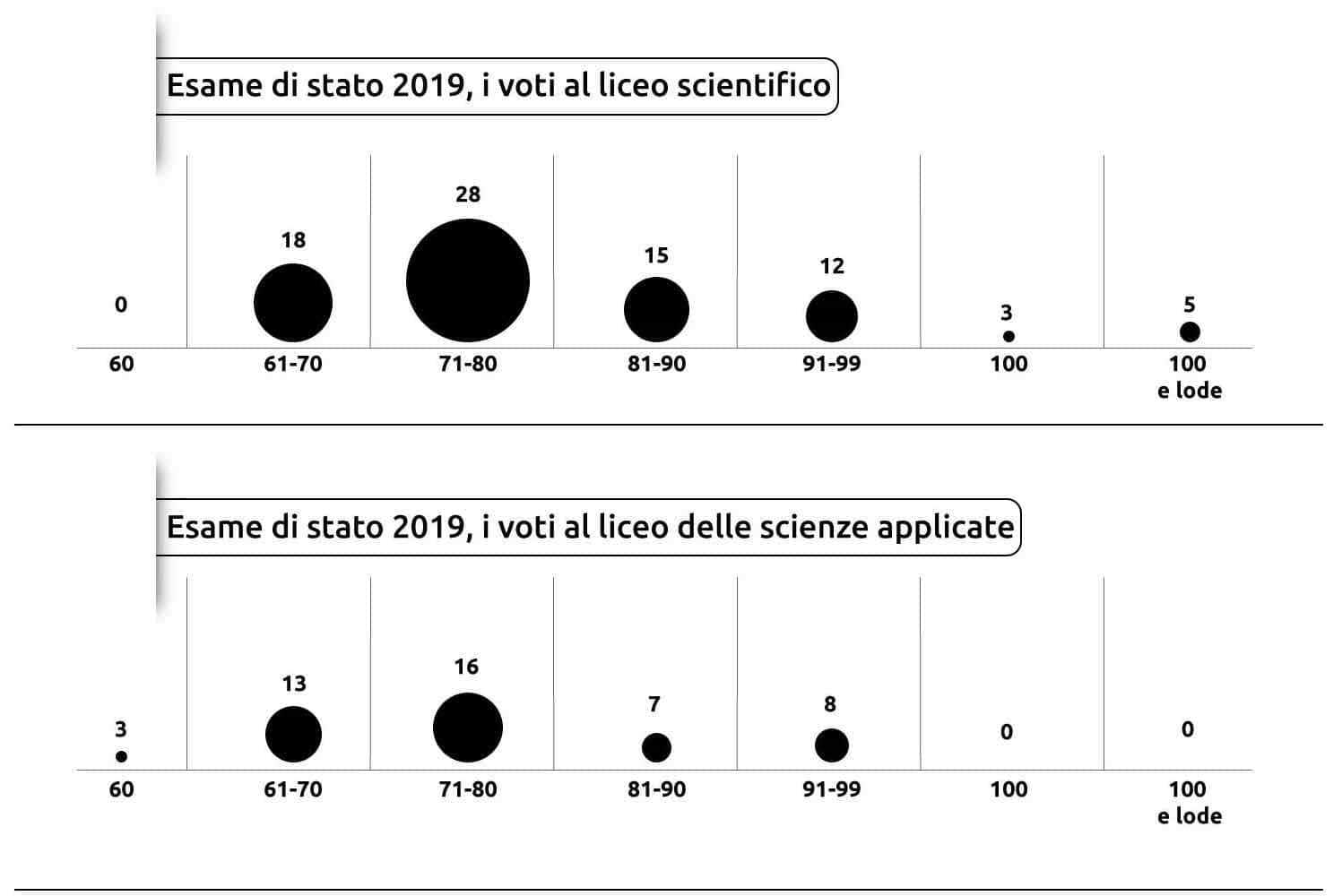 La distribuzione per fasce di voto degli studenti che si sono diplomati nell'anno scolastico 2018/2019; il confronto dei risultati degli ultimi tre anni degli esami di stato al liceo Galilei.
