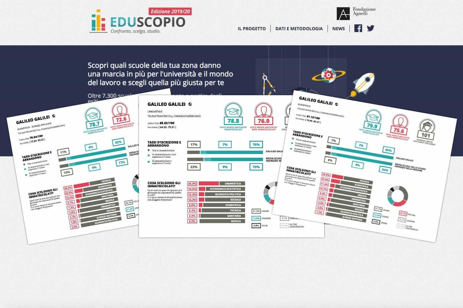 La Fondazione Agnelli ha pubblicato i risultati del rapporto "Eduscopio" del 2019. Per il sesto anno il rapporto cataloga i risultati del primo anno di università dei diplomati delle scuole superiori di tre anni scolastici (2013/2014, 2014/2015 e 2015/2016, solo 2014/2015 e 2015/2016 per i licei scientifici opzione scienze applicate) e consente di confrontare gli indici statistici elaborati per ogni scuola con quelli di altri istituti dello stesso indirizzo e collocati nella stessa area geografica.