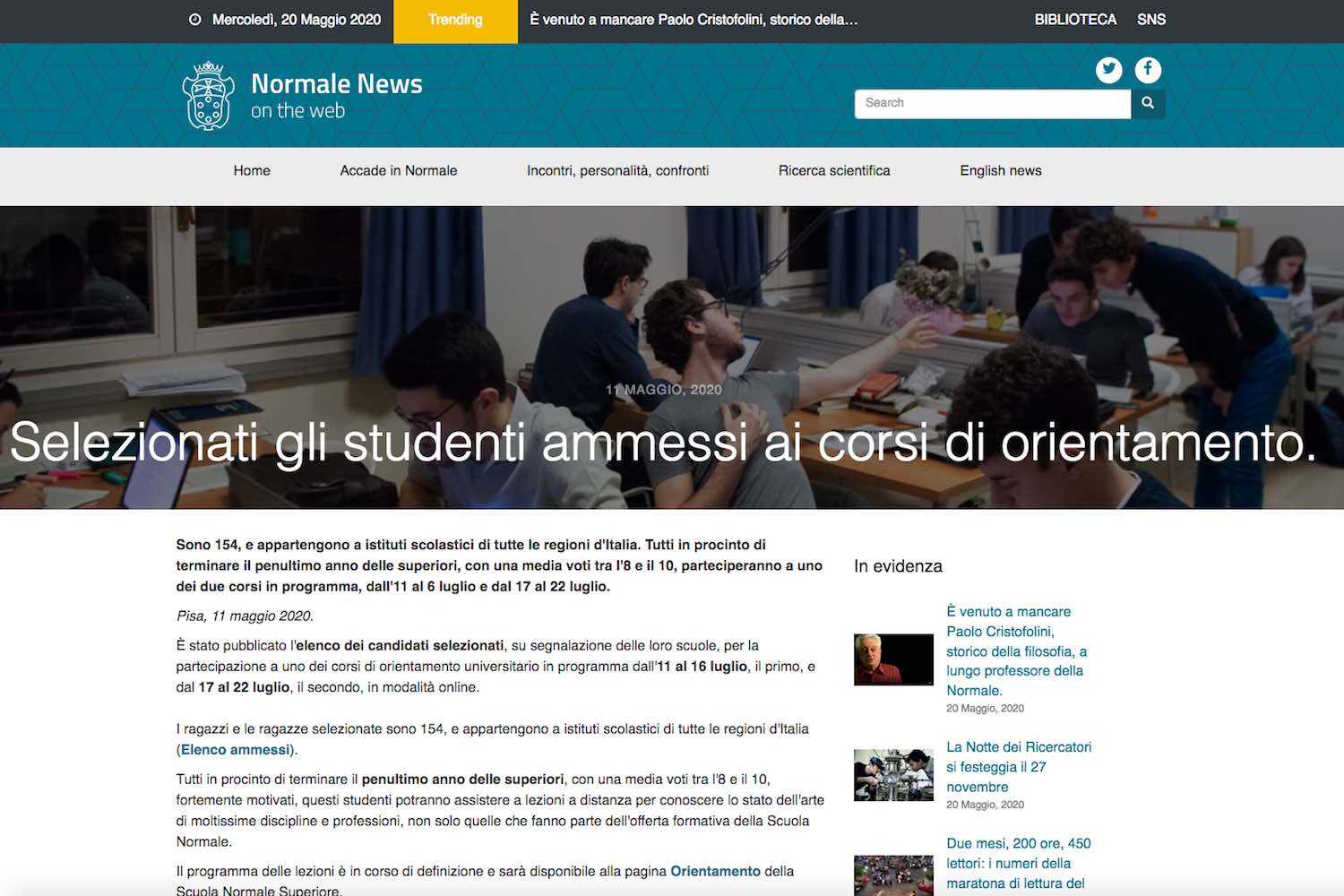 C'è anche uno studente del liceo Galilei tra i 154 che la Scuola Normale Superiore di Pisa ha selezionato per partecipare a uno dei corsi di orientamento universitario che si terranno dall'undici al 16 luglio e dal 17 al 22 dello stesso mese, quest'anno in modalità online. Si tratta di Vincenzo Truppa, che frequenta la 4aB del liceo scientifico.