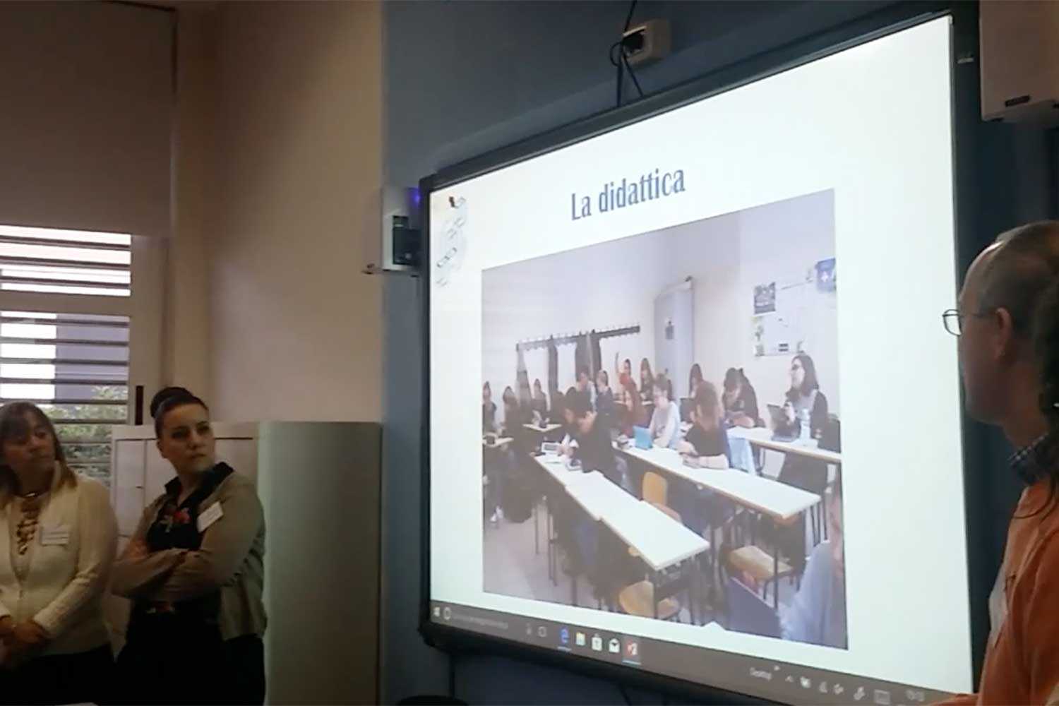 Il professor Lorenzo Aresi e alcune studentesse della 4aF mostrano all'interno dell'aula 3.0 alcuni esempi di didattica realizzata attraverso gli strumenti digitali.