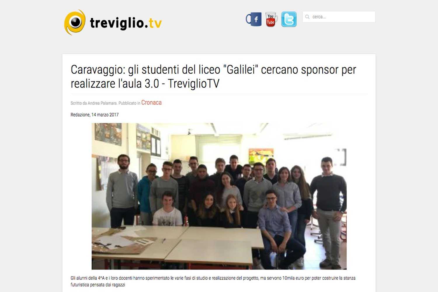 Un articolo pubblicato dal sito "TreviglioTv" racconta questo ulteriore passo che i ragazzi della 4aA hanno intrapreso. «Dite addio a muri come elementi di divisione assoluta, corridoi come semplici luoghi di transito, colori spenti e lezioni puramente frontali: la classe 4 A del liceo caravaggino dà il benvenuto all’architettura scolastica, con il progetto di un’aula 3.0. Pareti scorrevoli, biblioteca diffusa, scale come luogo di incontro e pareti di ardesia sulle quali scrivere lungo i corridoi. Può sembrare un sogno, una scuola del futuro, ma questi 19 liceali hanno realizzato passo dopo passo un vero e proprio progetto architettonico, che aspetta solo di diventare realtà», scrive il sito internet, che poi riporta le parole della professoressa Enrica Rossini, tra le animatrici, insieme alla professoressa Stefania Bressani, della settimana di alternanza scuola-lavoro durante la quale è nata l'idea dell'aula 3.0: «Il progetto è nato nell’ambito dell’alternanza scuola-lavoro e ha preso forma da un’idea proposta dal vice preside Lorenzo Aresi relativa allo studio per un’aula-tipo da attrezzare come spazio flessibile e coerente con i nuovi modi di fare didattica, un’evoluzione da un’aula tradizionale predisposta per lezioni frontali a un ambiente polifunzionale e modulare, sempre nuovo e stimolante sul modello di quanto è già stato realizzato in questo ambito in alcuni istituti secondari della Bergamasca. Sotto lo sguardo attento del dirigente scolastico Claudio Venturelli, sempre pronto a incentivare attività sperimentali che guardino allo stare bene a scuola, il progetto ha potuto prendere il largo».