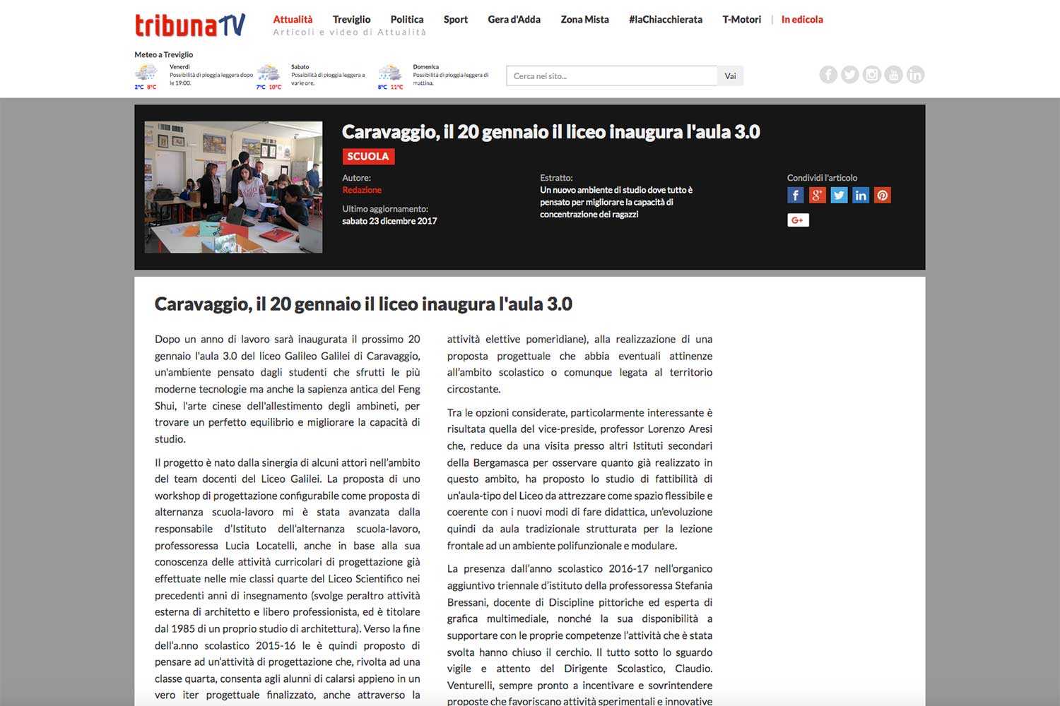 Il sito internet di TribunaTv annuncia in un articolo l'inaugurazione dell'aula 3.0 del liceo Galilei di Caravaggio, che si svolgerà sabato 20 gennaio 2018 alle ore 12:00.
