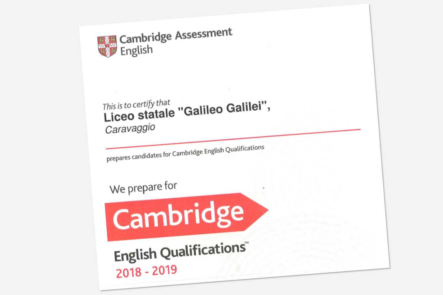 Il liceo Galilei di Caravaggio è un Cambridge ESOL Preparation Centre, è quindi autorizzato per la preparazione agli esami ESOL della prestigiosa università di Cambridge. I certificati Cambridge ESOL (English for Speakers of Other Languages) - noti e riconosciuti in tutto il mondo - facilitano la mobilità professionale e universitaria ed arricchiscono il curriculum. Più di 20.000 aziende, università e enti governativi riconoscono gli esami Cambridge ESOL.