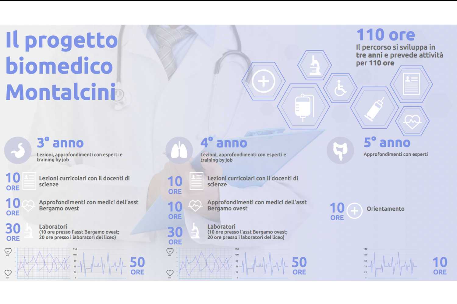 Le attività previste nelle 110 ore del progetto biomedico Montalcini, destinato agli studenti del triennio del liceo scientifico.